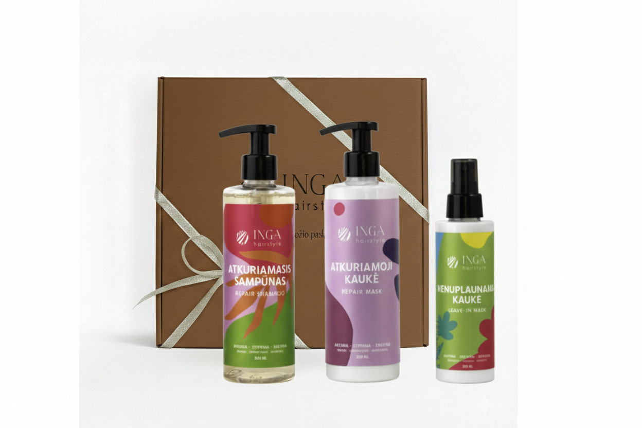Rinkinys skirtas intensyviai plaukų atstatymo rutinai. Šampūnas švelniai valo ir paruošia plauką, kaukė giliai maitina ir stiprina, o nenuplaunama kaukė suteikia ilgalaikę apsaugą nuo karščio, UV ir šiaušimosi. Idealus pasirinkimas toms, kurios nori gilesnio atstatymo be kondicionieriaus.